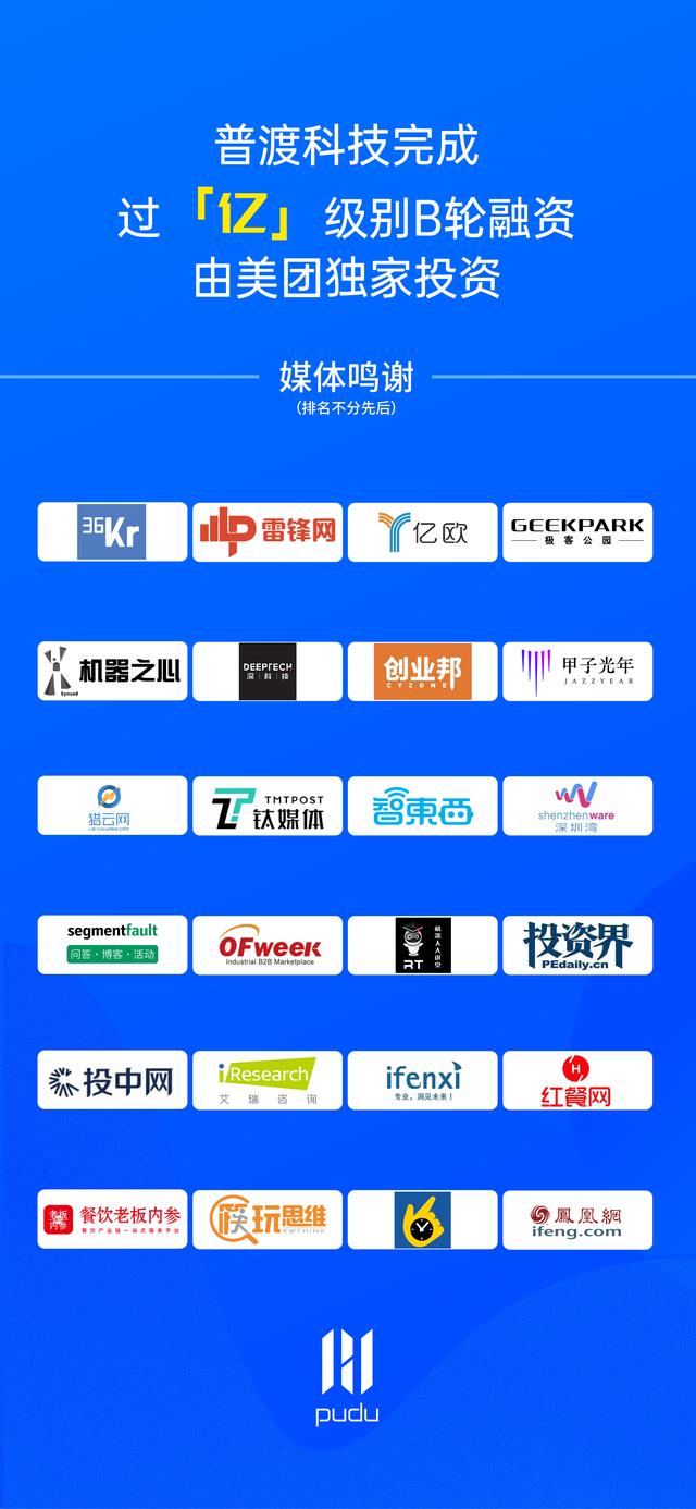 2020年7月1日,普渡科技正式公布公司已完成由美团独家投资的过亿级别B轮融资。此次融资受到客户、供应商、各同行、投资人的关注和赞誉,更受到多家专业媒体的跟踪报道。