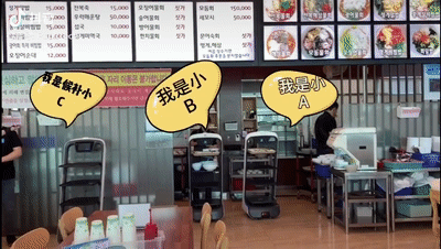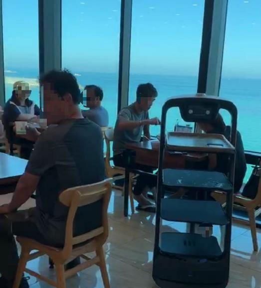 这就是韩国束草的网红餐厅Muhguri,整个店用了各种高科技手段,而其中的送餐任务,就交给了11台普渡机器人。