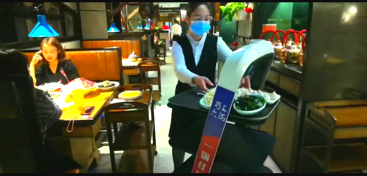 一道清甜的声音在耳边响起,正在准备吃火锅的张先生抬头,入眼的是一台造型简洁流畅的送餐机器人,只见机器人露出呆萌可爱的表情在旁边乖乖等待客人取餐。