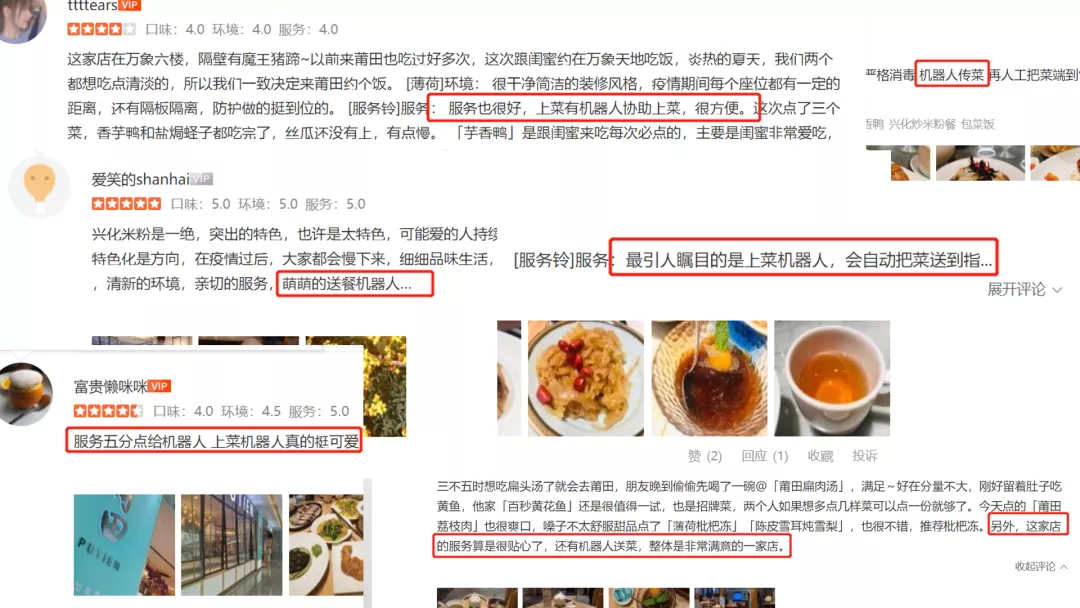 “上菜机器人真的挺可爱”、“最引人瞩目的是上菜机器人”、“上菜有机器人协助上菜,很方便”
