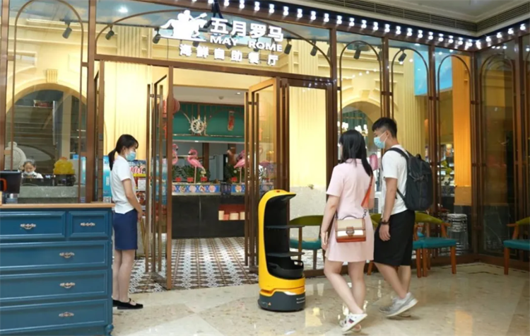 德思勤四季汇购物中心内遍布了各式各样的餐厅,为来往顾客提供了丰富的就餐选择。五月罗马海鲜自助餐厅(德思勤四季汇店)为吸引更多顾客、给餐厅打造新亮点,特地引入了配送迎宾二合一机器人“葫芦”。