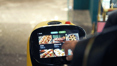 “葫芦”检测到顾客经过时,可以自动跟随顾客的移动而灵活地转动身体,这样它顶部的触控屏会始终面向顾客,方便顾客查看和触控。“葫芦”能和顾客进行语音交流,向顾客推荐门店特色菜品或者介绍促销活动,也能回答顾客的问询,瞬间化身门店的“小小迎宾员”。